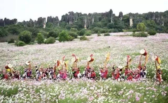 当下,正是乃古石林周围千亩波斯菊盛开的时节,红白相间的小花铺满大地,随着微风轻轻摇曳,宛如一片浪花轻舞的鲜花海洋。