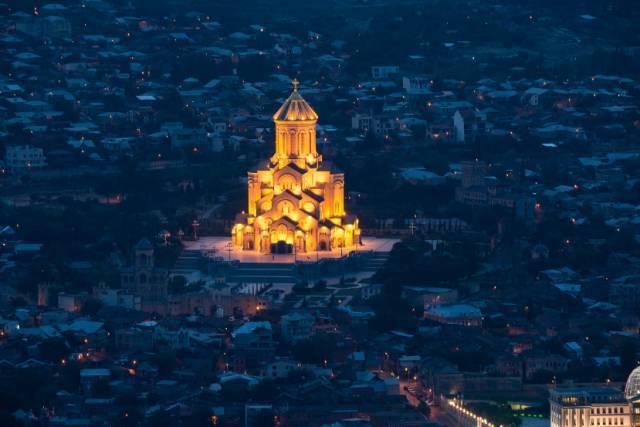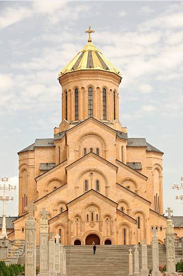 大教堂建筑包括主建筑、院墙、小教堂若干,主建筑高达100米,是格鲁吉亚最大也是世界第三大的东正教教堂。置身其中,远近高低错落十分漂亮。从第比利斯的各个角度,几乎都能看到。而且白天、夜晚所展现出来的景象各不相同,当地人结婚也首选在这里举行神圣的仪式。