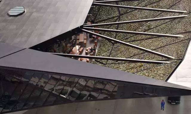 一楼是一个加油站,二楼向外探出的斜面其实是一个屋顶花园,光线和自然景致都顺畅地流入餐厅。公共空间宽敞舒适,所有服务区都被巧妙地隐藏起来,从外观看又充满设计感,让人过目难忘。