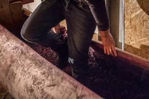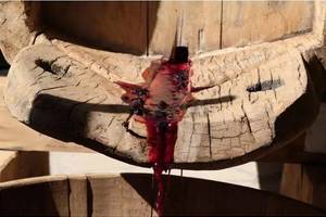 把刚采摘回来的葡萄倒入刨空的树干里,然后用脚进行踩压,慢慢的葡萄汁从树干一头流入到预先埋在土里的qvevri(奎弗瑞)陶罐或者叫克维乌里酒缸。压榨完成后再加入部分葡萄果皮进行混合,盖上盖子,封存,等待数月数年。