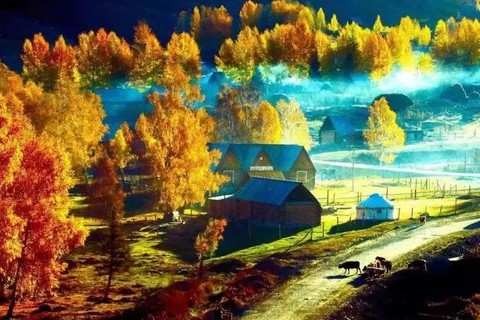 禾木村,它素有“中国第一村”的美称,是著名的图瓦人村庄之一。盆地周围山体宽厚,顶部呈浑圆状,河流多切割为峡谷,地形复杂,禾木河自东北向西南贯穿其间,保持着最完整民族传统的图瓦人集中生活居住在这里。来到禾木村,首先进入我们视野的就是那一栋栋的小木屋和成群结队的牧群,与雪峰、森林、草地、蓝天白云构成了独特的自然与文化景观。安排好住宿后,就可以四处在村子自由活动,可徒步至【美丽峰】从高处俯瞰这安静的小村落,傍晚可前往禾木观景台,观山中日落。