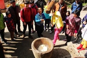 然后我们一起联谊,打麻糍、磨豆腐、烤玉米饼等,可现场品尝。我们的队员还可以穿上少数名族和村民一起劳作,载歌载舞,留影。外婆坑家中午餐。