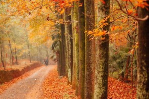 一路醉人的秋色,金黄的银杏、火红的红杉、斑斓的枫香,以及铺满地的秋叶,把这里装点得犹如童话世界。
