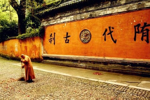 浙江天台国清寺建于随朝,是唐代鉴真大和尚东渡东瀛的始发地。寺院西侧有一小溪,山水从西向东长流,流到寺院外调转方向又向西流走,碑记“一行到此水西流”。