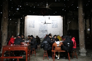 瞧:窗外雪花纷纷飘,屋内肉香扑鼻来;邻里相坐生暖意,众人皆欢齿生香。徽州的浓浓年味啊!