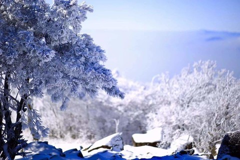 漫山遍野的树枝上挂满了玲珑剔透的冰晶。