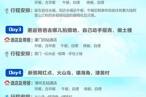 今天全天为活动集合日,前往厦门集合报到。安排接机前往指定酒店。到达指定酒店后报“xxx+姓名”办理入住,酒店一般于14:00后办理入住,先到的小伙伴可将行李先寄存在前台。领队会于前一天晚上22:00前联系各位,请保持手机通畅。