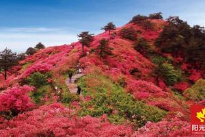 满山鲜艳的映山红,连绵不绝,染红了整个山坡、漫山遍野的杜鹃花“明火执仗”地盛开着,令人眼花绕乱,目眩神迷。来张酷炫的大合影。