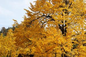最为震撼的黄,就在景区内的一条“黄金大道”,栽满了银杏。黄透了的银杏叶飘满了枝头、堆满了地面,铺就了一条松软的路,踩上去沙沙作响。