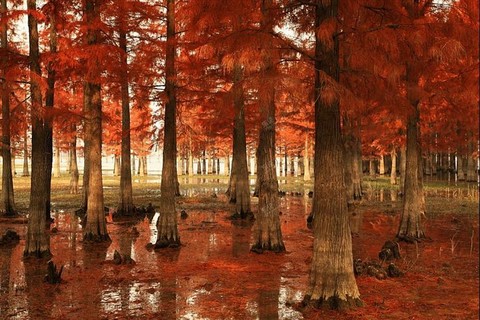 初冬季节,衫叶已红,倒映水中格外美丽。四明湖水中红杉林秋景斑斓,十分耀眼,当你抵达湖畔,看到眼前这么一大片、一大片红绿相间的水杉林挺立在水面,惊呆了。。。当中点缀着部分还没有红的绿叶子,当真是色彩绚丽多姿!