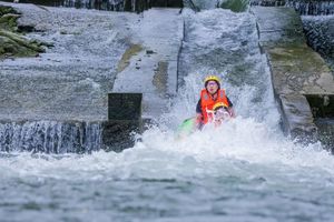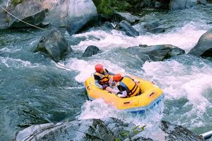 3、在下急流时,要抓住艇身内侧的扶手带,坐在后面的人身子略向后倾,双人保证艇身平衡并与河道平行,顺流而下。