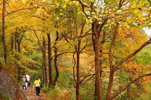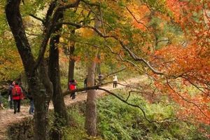 10:30 抵达徒步起点,沿途公路两旁景色迷人,秋风沉醉的青石沧桑古道,两侧高大枫树连绵。我们不紧不慢,边走边拍,先是上坡,一路有亭台古桥休息。大约徒步1.5小时左右到了山顶,有很大的平台,有济公庙,山中老村,与世隔绝。