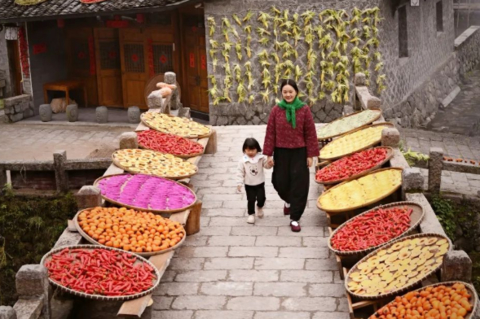 秋天的时候来这里就像是来到了婺源。屋顶上、村子边、还有桥上都晒满了一筐筐的辣椒、玉米,满是野趣。