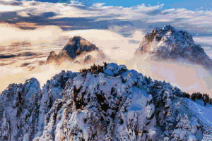 云海是冬游黄山的一大奇观。黄山冬天的云海气势磅礴、雄奇壮美,以酣畅淋漓的大笔触挥洒而就,比平时显得更加奇绝壮观。冬日云海演绎浩瀚飘渺的玄虚意境,以凌空俯视开恢弘磅礴之山势,视野平远,天光云影一览无余。