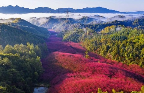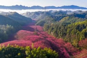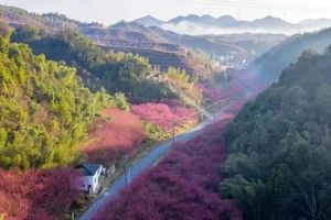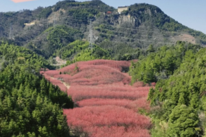 米积村米积山脚下,十万多株樱花竞相开放。这种樱花树叫“中国红”,因花色绯红,花姿出众而得名。