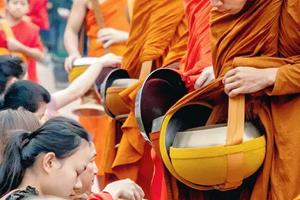 uk-tuk声响起的时候,琅勃拉邦就醒了过来。四点钟的天,说蒙蒙亮都有点勉强。往香通寺行,沿路会看见为当地僧侣布施的队伍浩浩荡荡,接近寺庙,是盛装的老挝人,他们跪在街边,举着饭锅或是竹篮,为经过的僧人施糯米饭。每位僧侣在一只篮中只取很少的饭,为了化够一天的饭食,要走很远很远。不属善男信女,我们只是在街对面观看,这过程安安静静的,却很有力量。