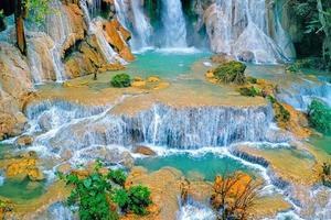 光西瀑布:光西瀑布在琅勃拉邦南边30公里的山里,是由一个大瀑布和六七个小瀑布组成的多层瀑布群,一波三折、三层瀑布蹦跳着倾泻而下,在原始雨林中形成很多个线条婀娜的水潭,阳光下泛起碧绿的、蔚蓝的光泽。老挝著名的瀑布自然风光,有世界八大天然泳池之一的美誉。是现实版的“阿凡达水之道”或者是“热带版的九寨沟”,是比较好的人文拍摄点。