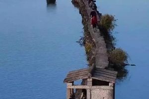 约一个多小时我们到达绍兴㹧(ang)犭茶(sang)湖,读作"昂桑湖",位于绍兴市北部灵芝街道林头村北首至七里江村平风湾犭央 犭茶湖上。始建于明代,是沟通南北两岸交通和船只躲避风浪的通道。避塘形似纤道,是由塘堤、石桥、石亭相间组成的长桥,是沟通南北两岸交通及供船只躲避风浪的重要通道。