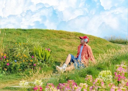 面朝花海俯拍背影,仿佛世界就在脚下