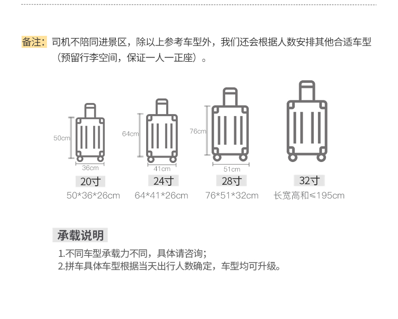 备注:车型承载力有限,携带行李为24寸或以下行李箱。